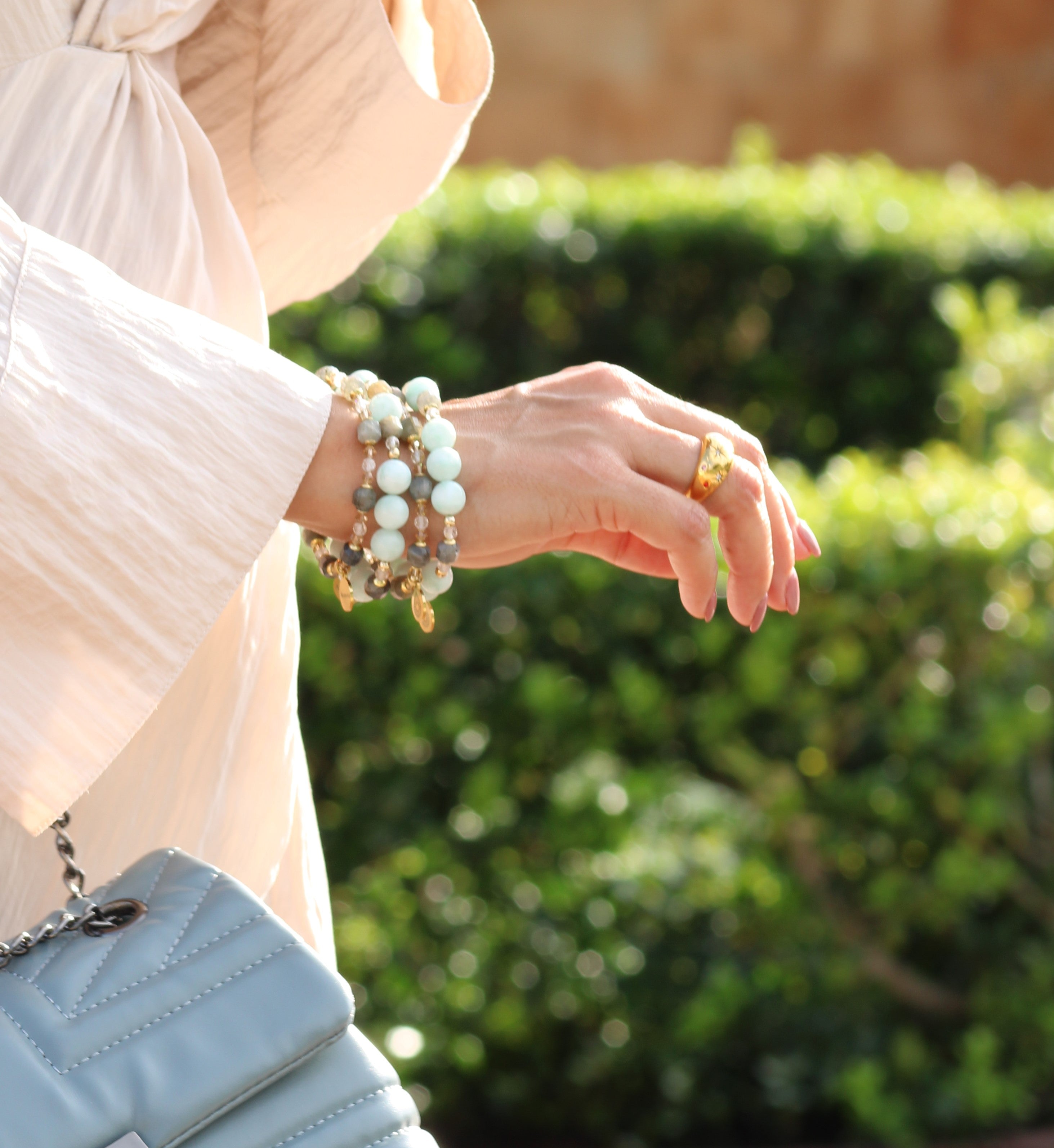 Showering or swimming while wearing your jewelry is not recommended as exposure to water can damage gemstones and weaken the stretch elastic.