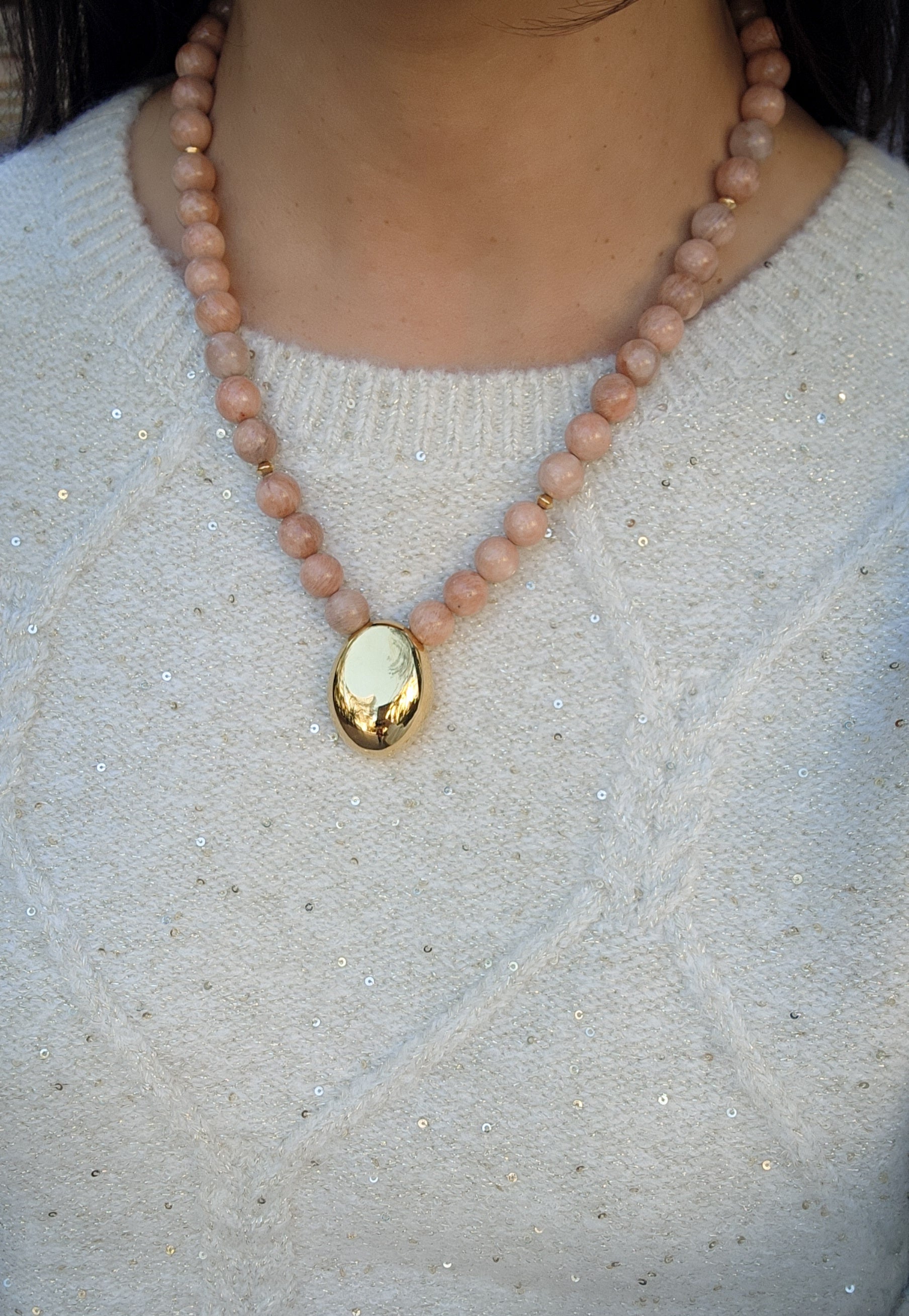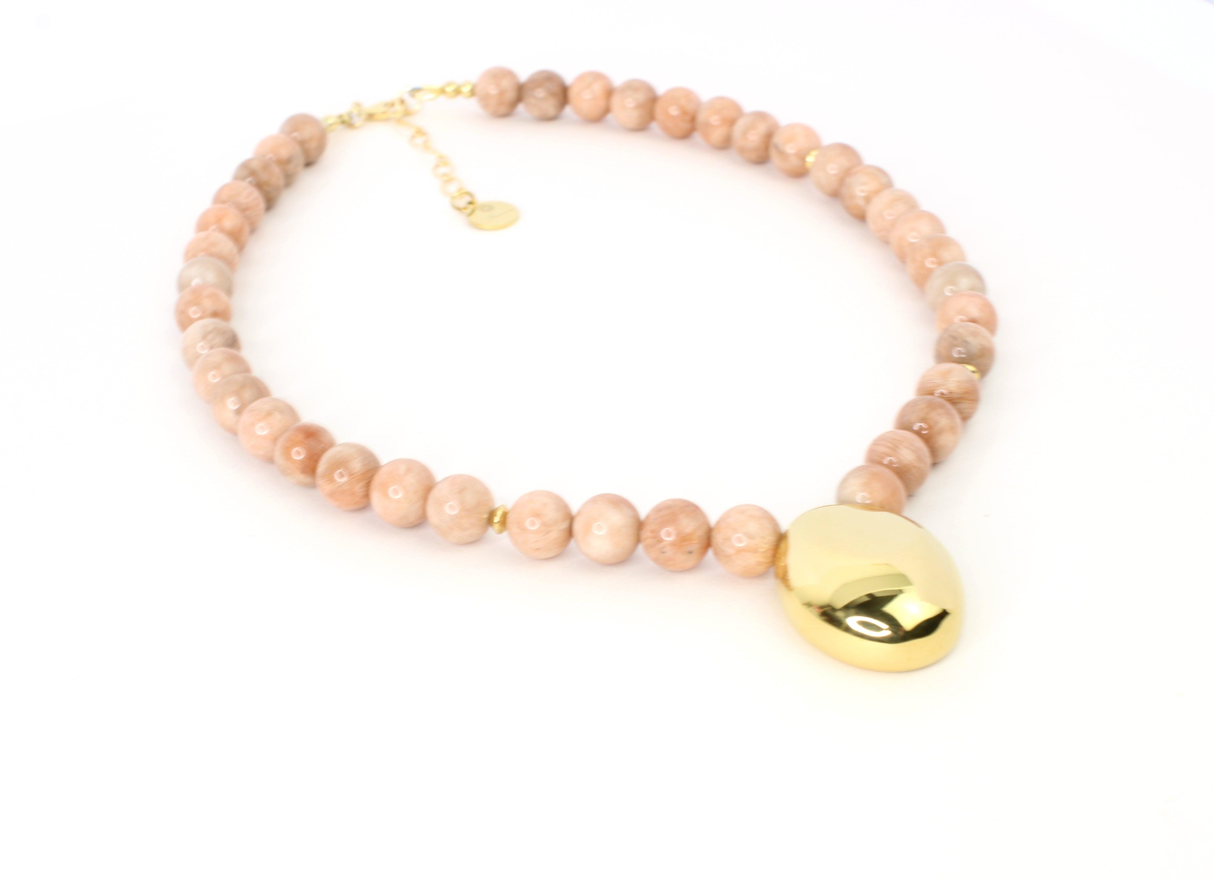 Embrace the beauty of nature and sustainability with our stunning Peach Sunstone Bead Necklace. This one-of-a-kind piece features the serene glow of peach sunstone, known for its calming energy and radiant, soft hues, paired with vibrant gold plated pendant that add touch. Each bead is carefully selected to create a harmonious design that celebrates both style and sustainability.