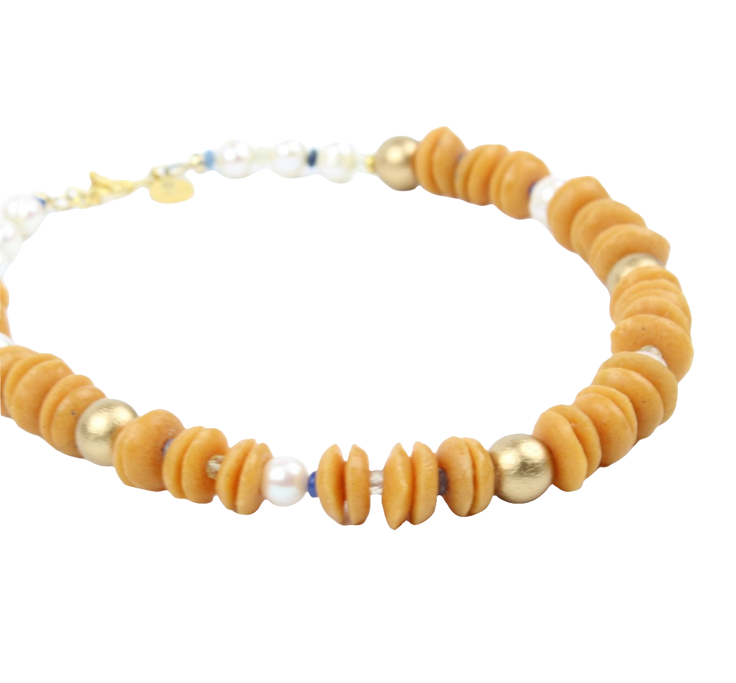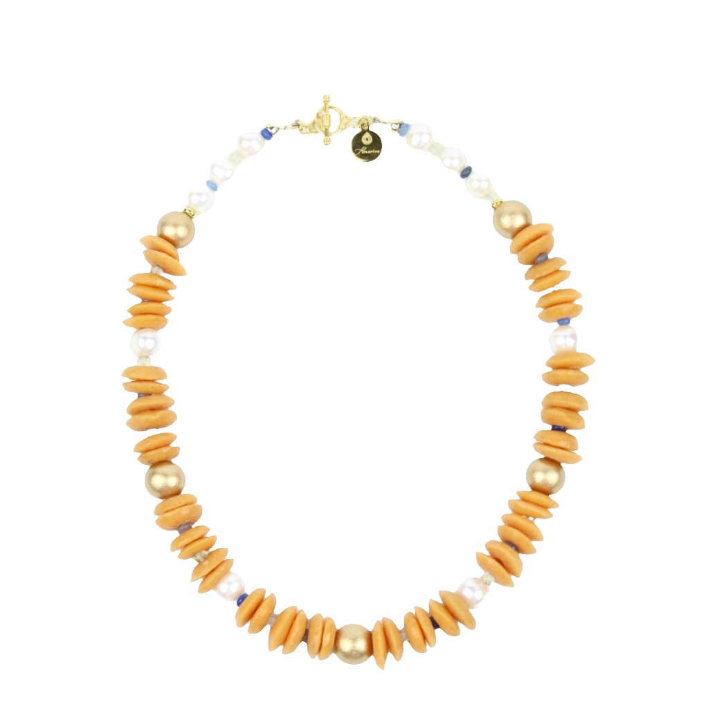 Say hello to the Akua Necklace, consciously crafted statement piece strung with recycled glass beads, is a fun, unique accessory that is perfect for adding a little sass to your day. This color-blocked featuring Orange along with freshwater pearls, lime quartz, aventurine and gold painted natural wood. It's beautiful and playful when worn alone, but looks great mixed into a variety of layering looks.