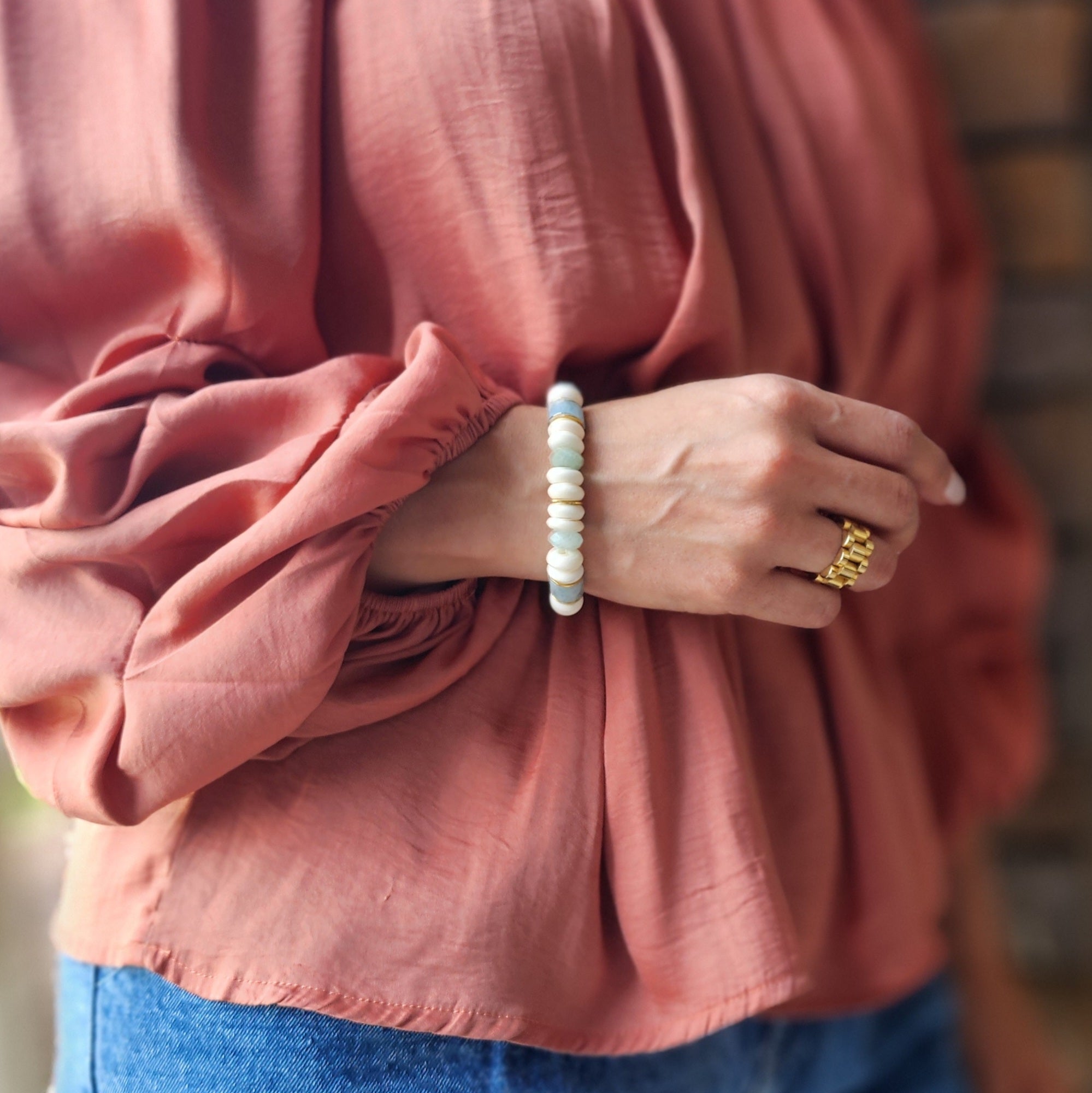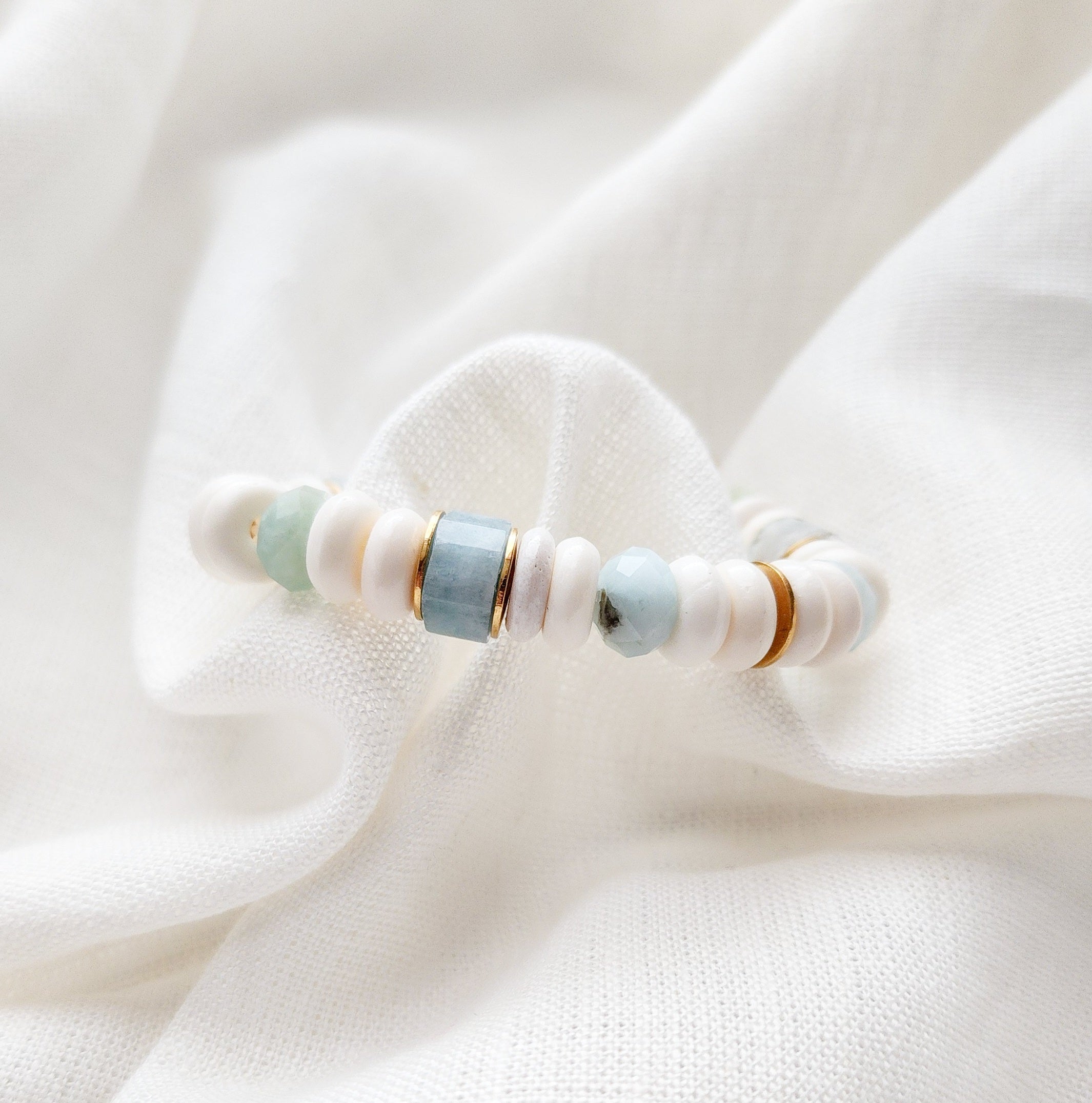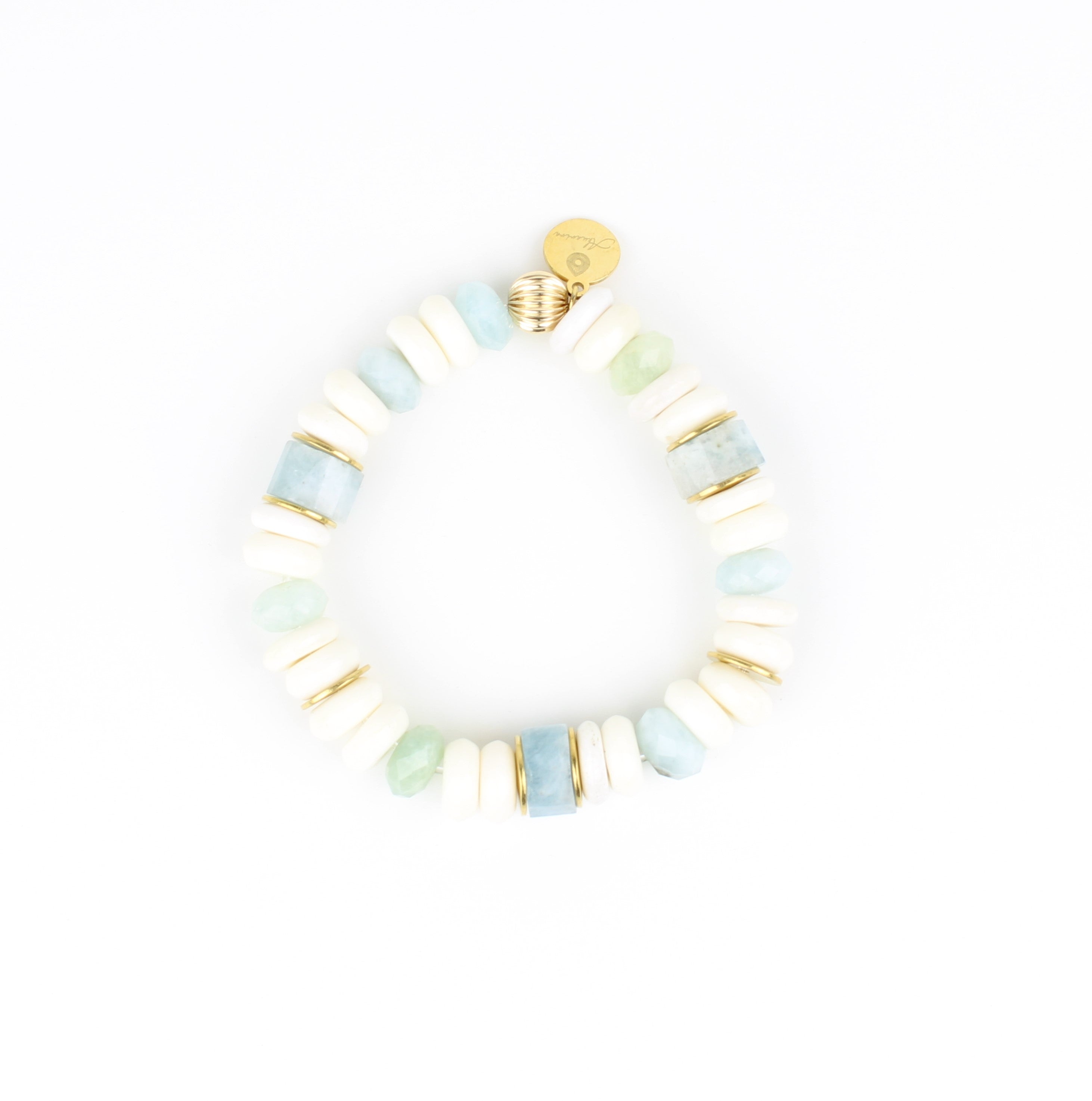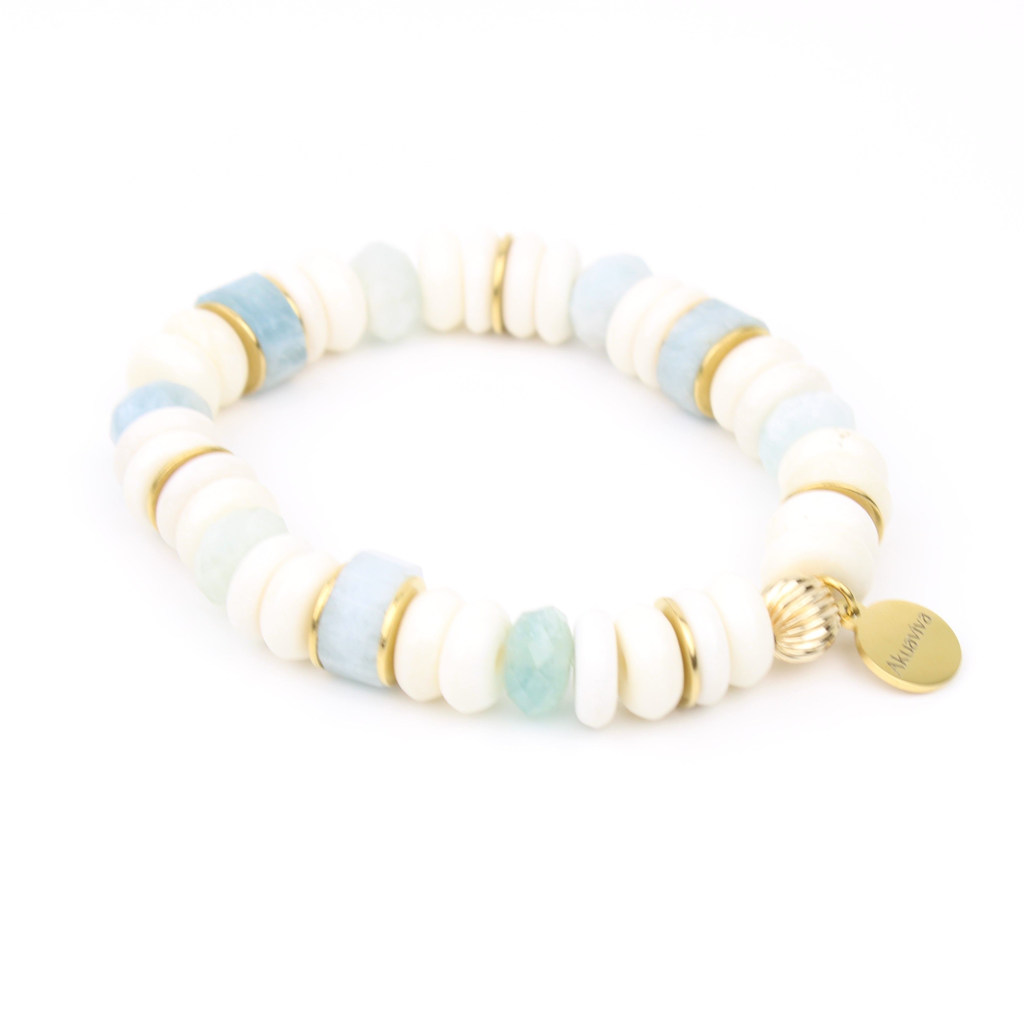 - Designed with Aquamarine, White Mala Bone beads and gold plated accents.