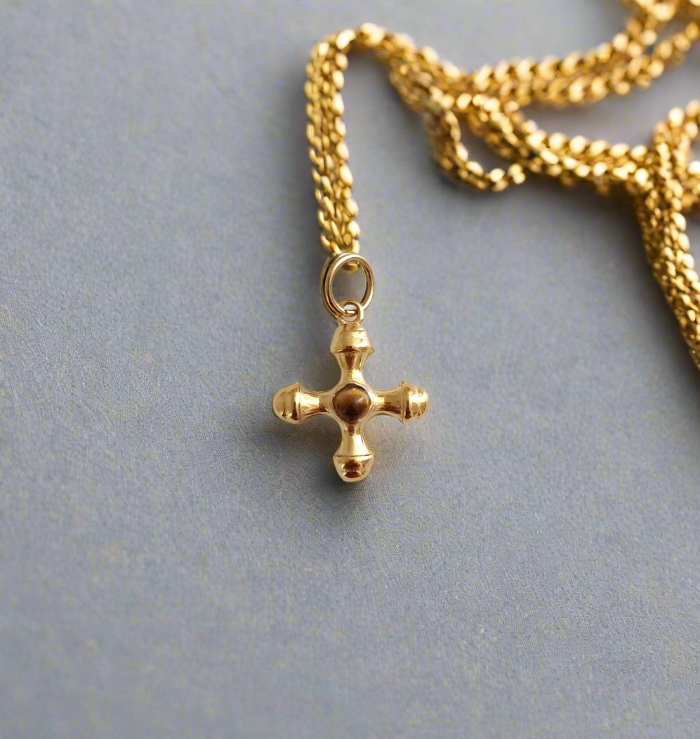 This gold cross pendant features a luminous tiger eye and green onyx stone at its center, adding a subtle sparkle that captures both light and meaning.