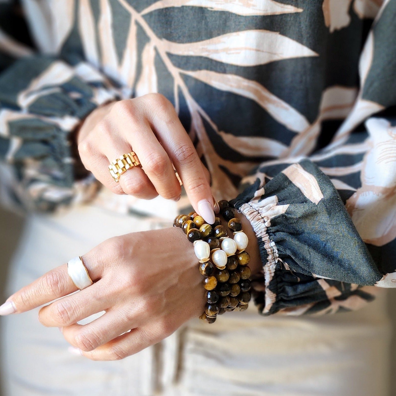 • Designed with AA+ Tyger Eye gemstones, Pearl and Gold Vermeil accents